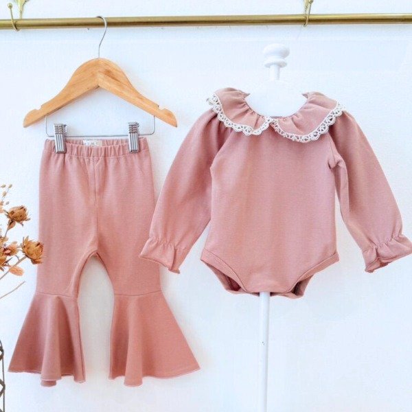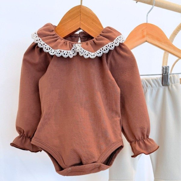 Body confeccionado en algodón elastizado con cuello con volados a tono con detalle de puntilla. Manga larga con volado.