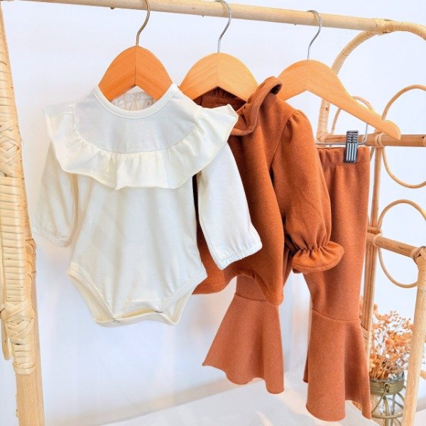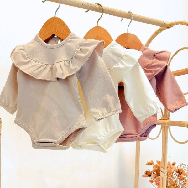 Body confeccionado en algodón elastizado con cuello con volados bajos a tono. Manga larga.